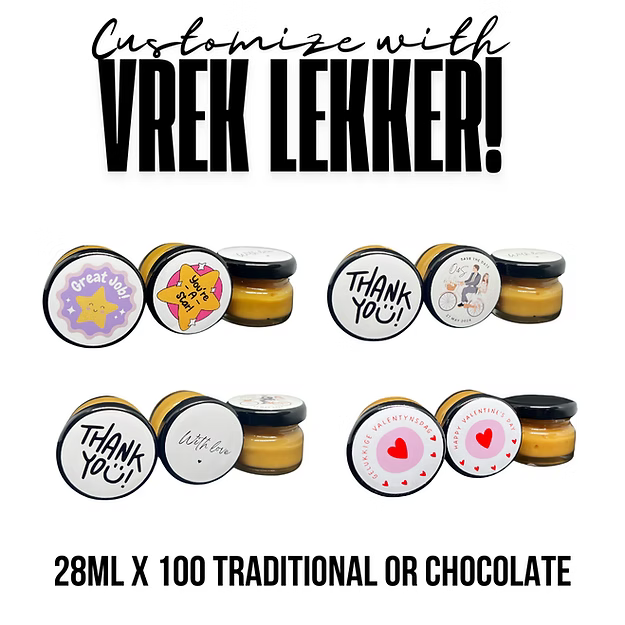Each jar is carefully filled with our creamy, handcrafted fudge and sealed for freshness. Add your own custom stickers or let us brand them with our signature Vrek Lekker! charm.